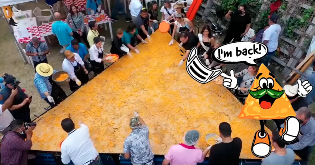 El Nacho más grande del mundo que elaboramos mide 3mts + 80cm por lado y esta registrado en Récord Guinness.